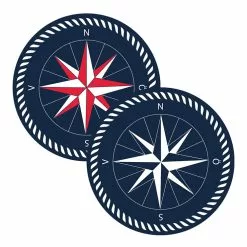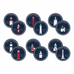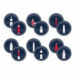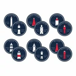 The six different coasters are navy blue and available in three different sets with Swedish lighthouses printed on both sides together with their longitude/latitude: West Coast, South Coast and East Coast. There is also a set of 6 nice compass roses where the compass roses are white/navy blue on one side and red/white on the other side.