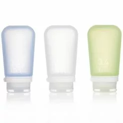 The travel bottles can be filled with either easy-flowing liquids or viscous creams. The caps are easily removed and the large openings make the bottles easy to fill.