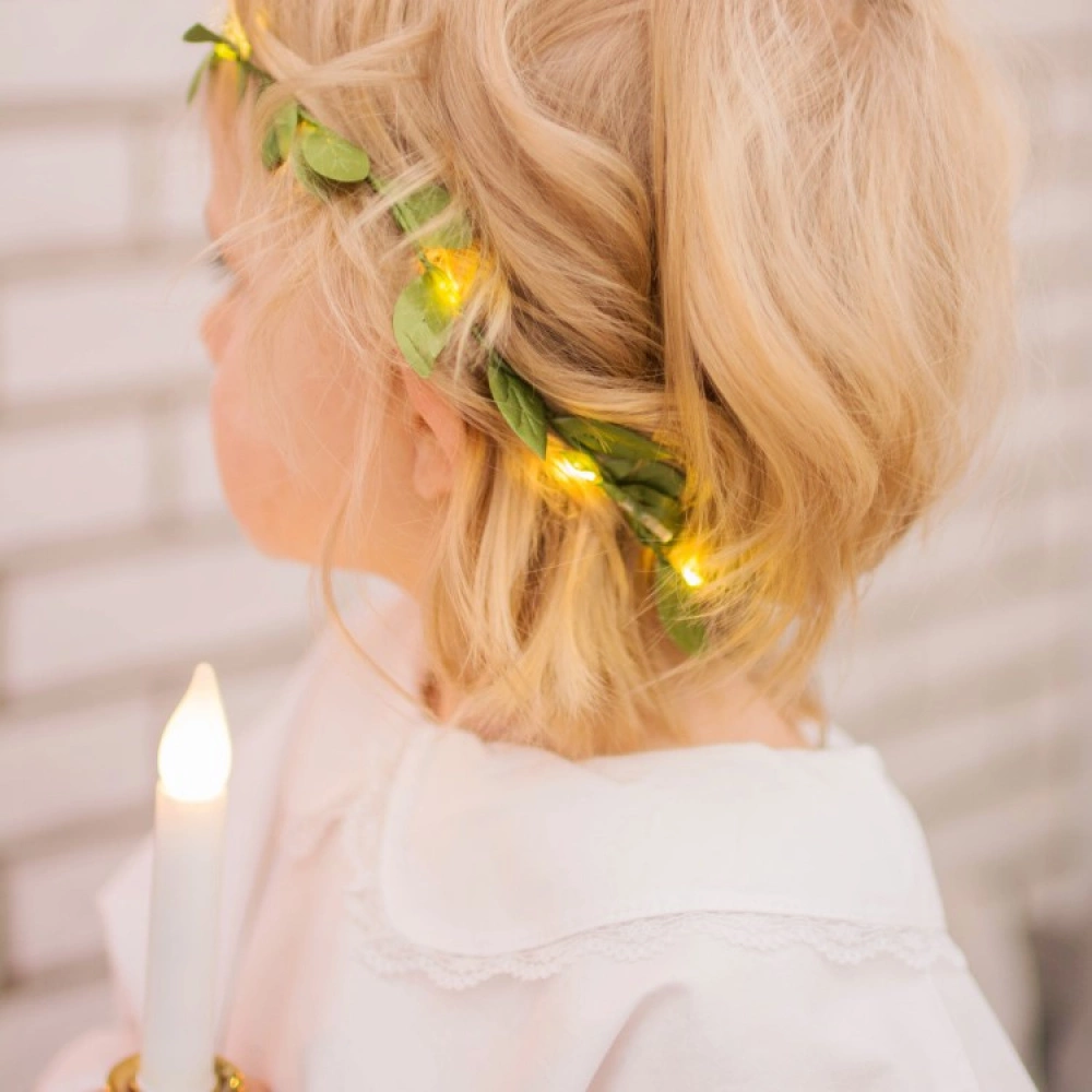 The string light is 95 cm long and has ten small LED-lights that are placed with 10 cm space between them along the loop. The string light also has 30 cm extra power cord between the lights and the battery box. That makes it easier to hide away the battery box regardless of whether you have it lying on the table or stuffed in your clothes if you are using the lights as a wreath in your hair.