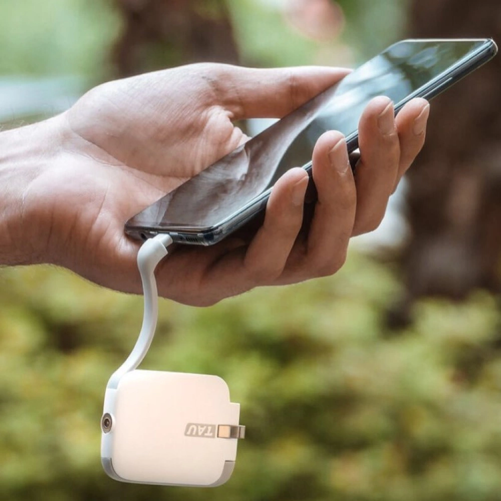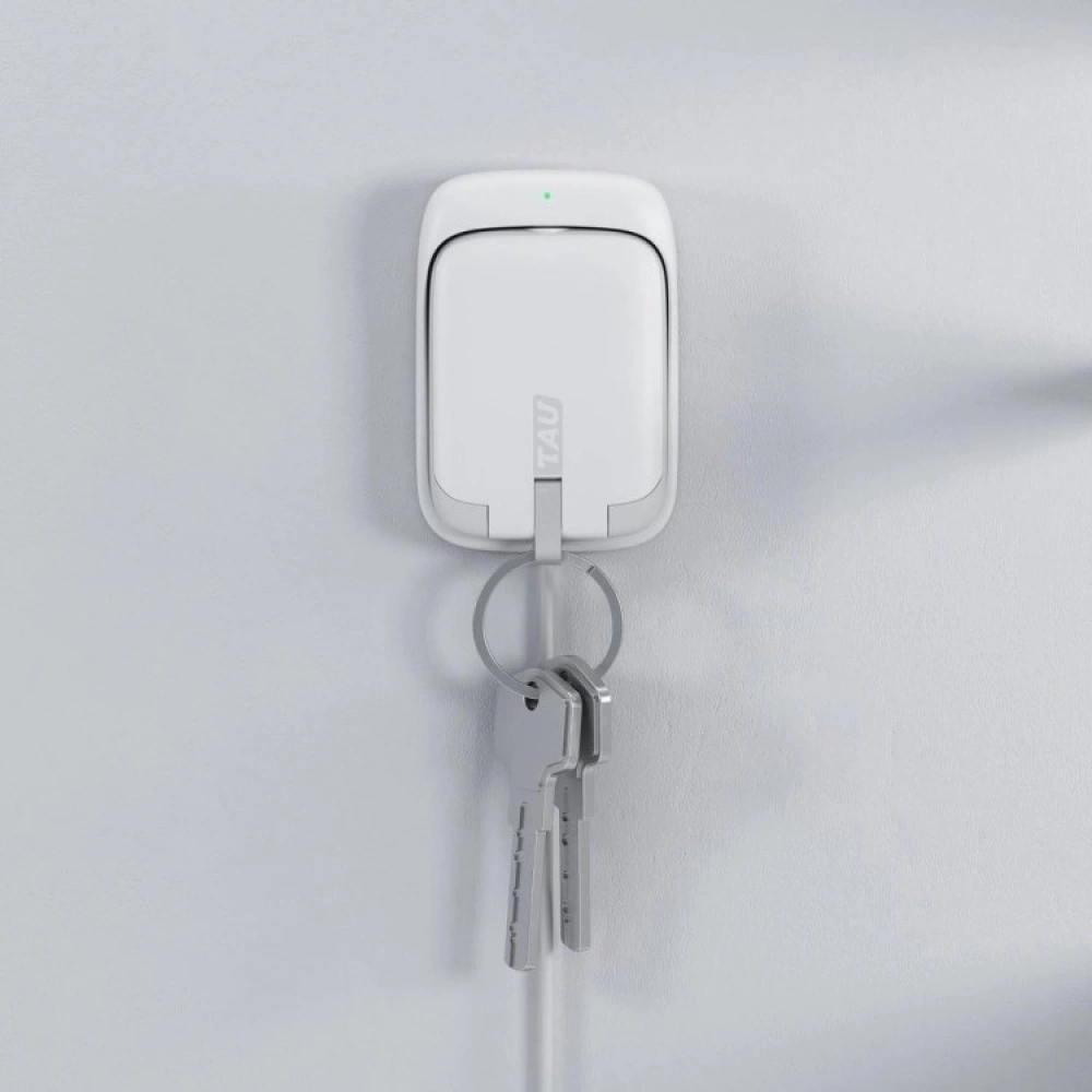 Tau is a practical small Powerbank with integrated charging cables that can charge all types of smartphones, headphones and other USB-charged devices. The Powerbank weighs only 40 grams, is no larger than a modern car key and has a small metal loop that allows you to easily hook it to your keychain.