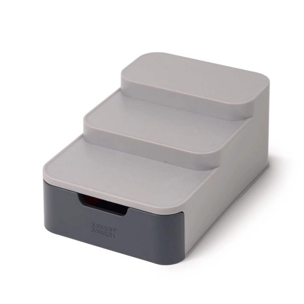 This storage shelf from English company, Joseph Joseph, gives you a better overview of what is in your kitchen cupboards. The three shelves make it easier to see the labels on jars and packaging, and in the pull-out drawer under the shelves, you can store small stock cubes and spice bags.