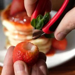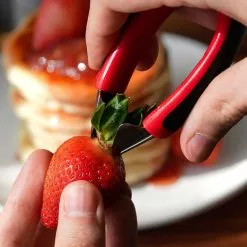 The strawberry huller can remove the stems strawberries of all sizes and shapes. The comfortable handle springs out between each stem removal, which makes it both quick and easy to hull the strawberries. In addition, it keeps your fingers clean.