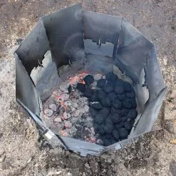 5. Place the stump chimney around the stump so that it can stand firmly. Adjust the height of the metal sides where needed and seal with soil under the metal sides. It is important to seal gaps at the bottom as the holes in the metal sides are adapted for optimal air flow. If air also enters from below, the briquettes will burn to quickly.