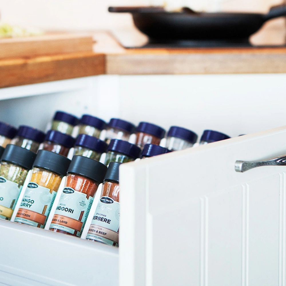 You can buy several spice racks to sort the spices according to use, or organise the rack to have your most used ones are at the front. For example, lift out the whole spice rack with spices for the barbecue and take them to the grill!