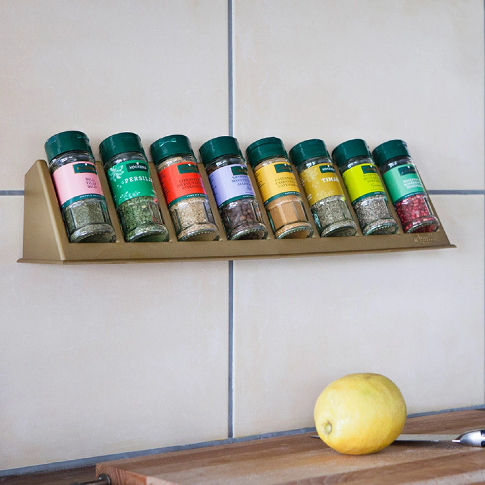 You can put the spice rack on a shelf, in a long kitchen drawer, or on the counter. You can also hang the spice rack on the wall and use it as a shelf to keep the spices out of the way.