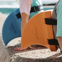 The Swimfin is easy to put on, held in place on the back with two velcro bands, leaving the arms of the swimmer completely free to play and swim in most of the different swimming styles