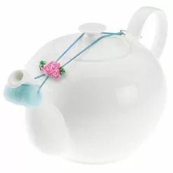 The drip catcher is equipped with an absorbent foam sponge, an elastic band with a metal hook and a decorative porcelain flower. Place the sponge under the spout of the teapot and either attach the elastic band around the knob on the top of the lid or hook the metal hook onto the teapot’s handle.
