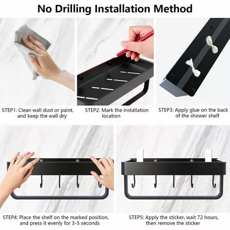 【Without drilling】Shower shelf can be fixed to the wall with a load capacity of 10 kg directly with glue. We also offer drilling accessories for uneven walls.