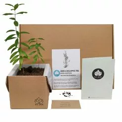 The kit comes with seeds, nutrient-dense soil, a waterproof cultivation box and a cardboard box that you plant the tree in. The different trees available in this kit are: eucalyptus,lemon and pomegranate. All the different trees are just as beautiful and have different perks. The eucalyptus tree gives a refreshing smell to your home and the lemon and pomegranate trees can start growing fruit within a year!