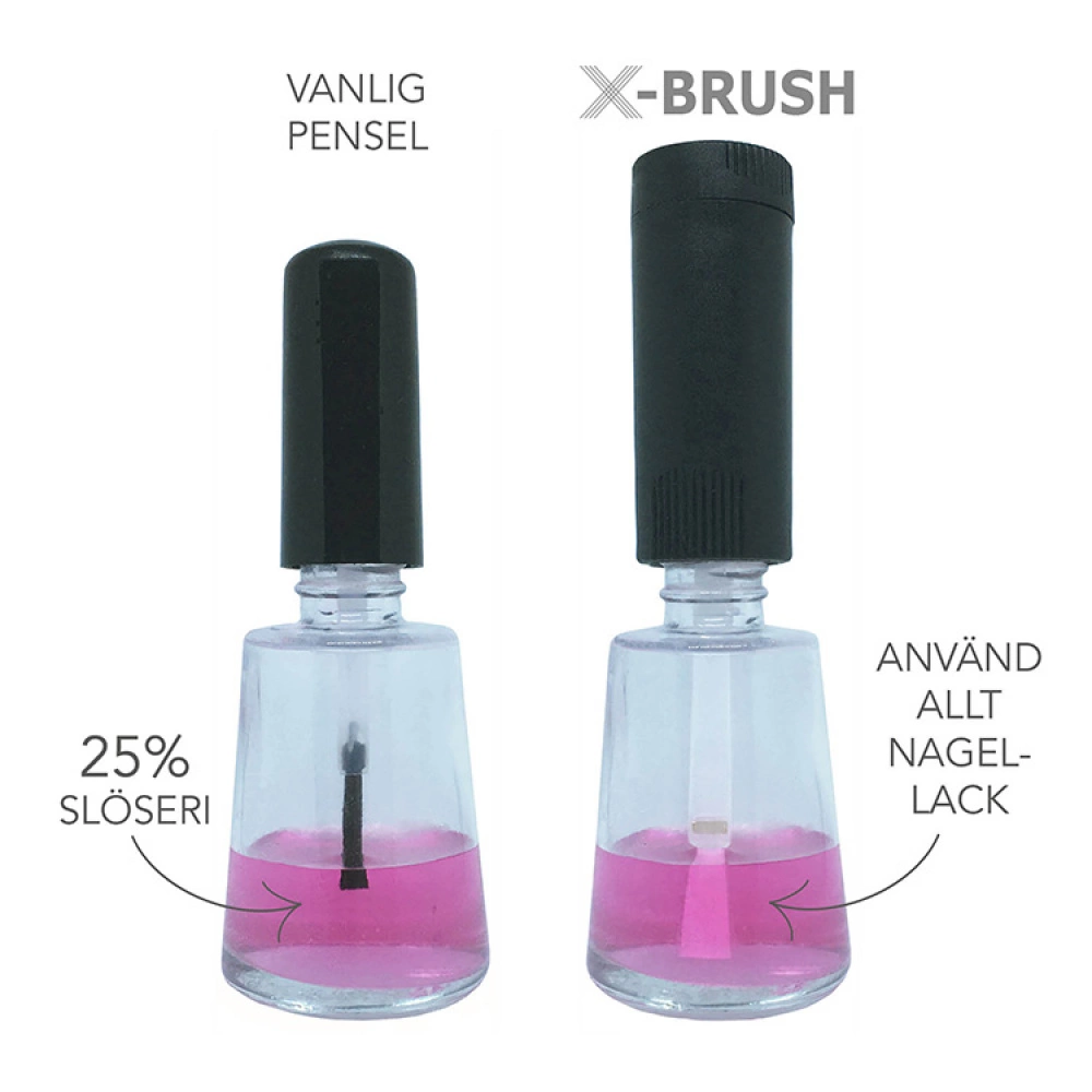 X-brush is a fantastic brush for nail painting and is easy to clean, all you need is a cotton ball and some nail polish remover. X-brush can even replace the brushes of bottles that are 3 cm high with a small twist top (approximately 1 cm in diameter) so that you always have a brush at hand.