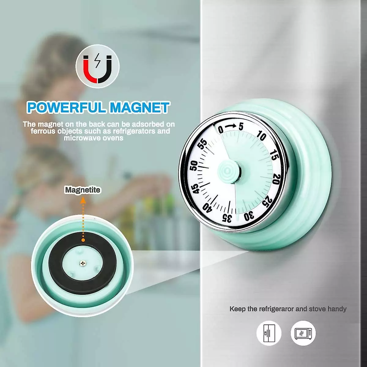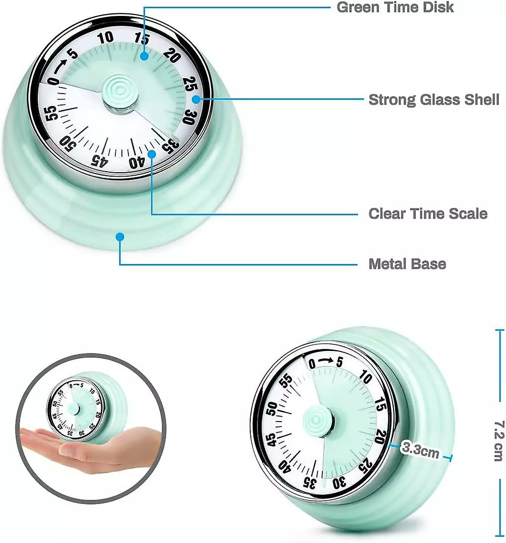 Alarm sound of up to 72dB can be easily heard in low noise conditions, which means you will never miss it even if you are in another room.The magnet on the back can be adsorbed on ferrous objects like refrigerators and microwave ovens, finished in mint green, it is pretty and practical.