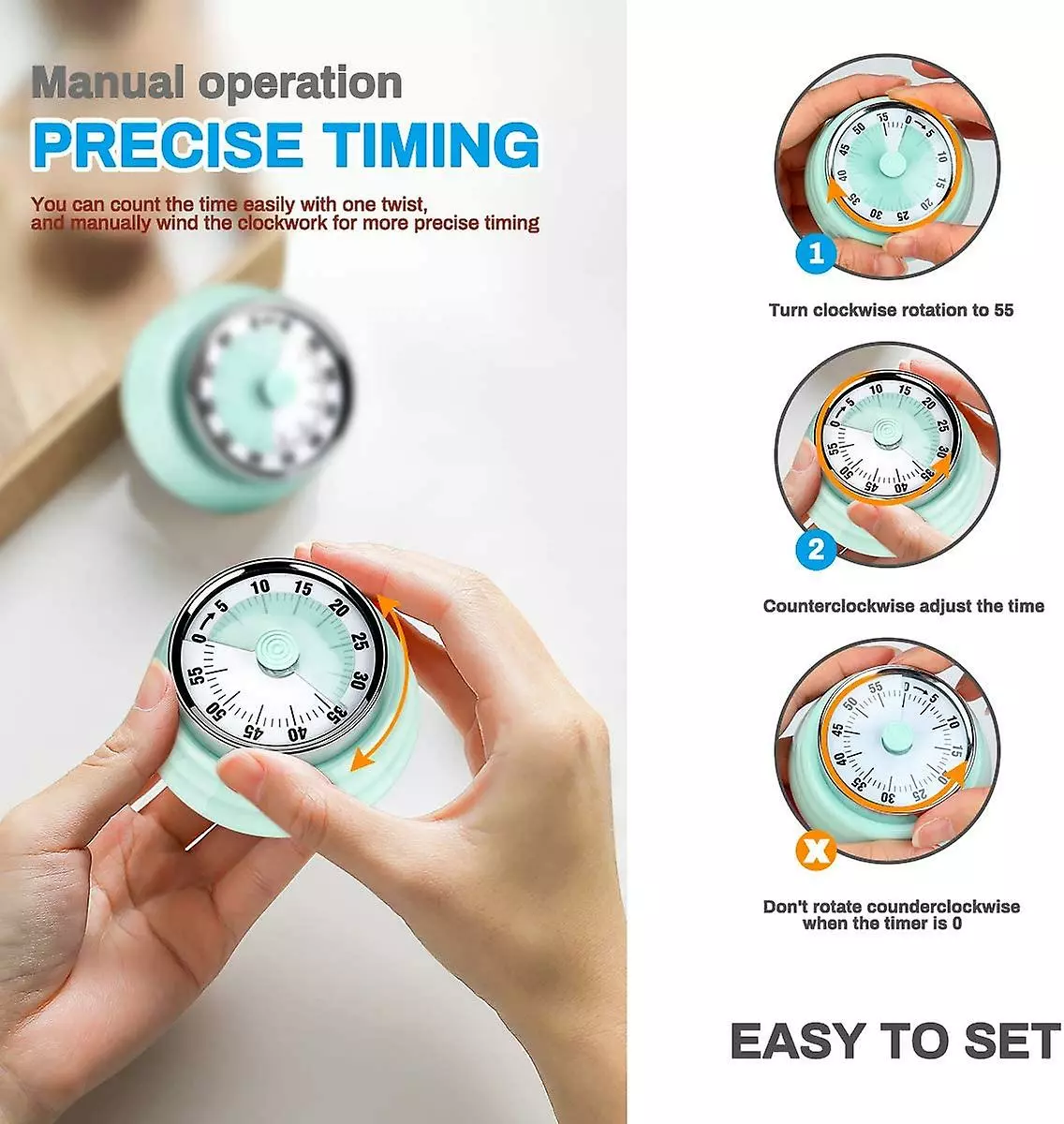 HOW TO USE: Clockwise, turn the green pointer to ” 55 ” (do not exceed ” 0 “), then turn counterclockwise until the desired time.
