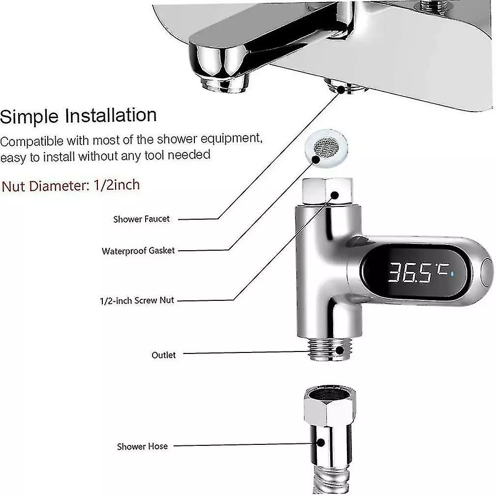High Precision Tester: built-in high precision temperature sensor, providing 0~100C measurement range and 0.5C accuracy. Celsius/ Fahrenheit display selectable.No Battery Needed: built-in small-scale hydro power system to generate current, no battery needed or power leakage risk. It will automatically turn off after no water flow.360 Rotating LED Temperature Display: clear LED screen enables you to tester the shower temperature in real time. 360 rotatable for better viewing.Ultra-Practical Shower Thermometer: with this thermometer, we can take shower with just right water temperature, especially suitable for the family with babies.Easy Installation: 1/2 inch nut, compatible with most of the shower equipment, easy to install without any tool needed.ColourSilverPower source:Self-contained hydroelectric power generationUnit count:1.0 countItem dimensions L x W x H:8 x 8 x 3 centimetresPackage include:1*LED Digital Shower Temperature Display Water Thermometer Tester
