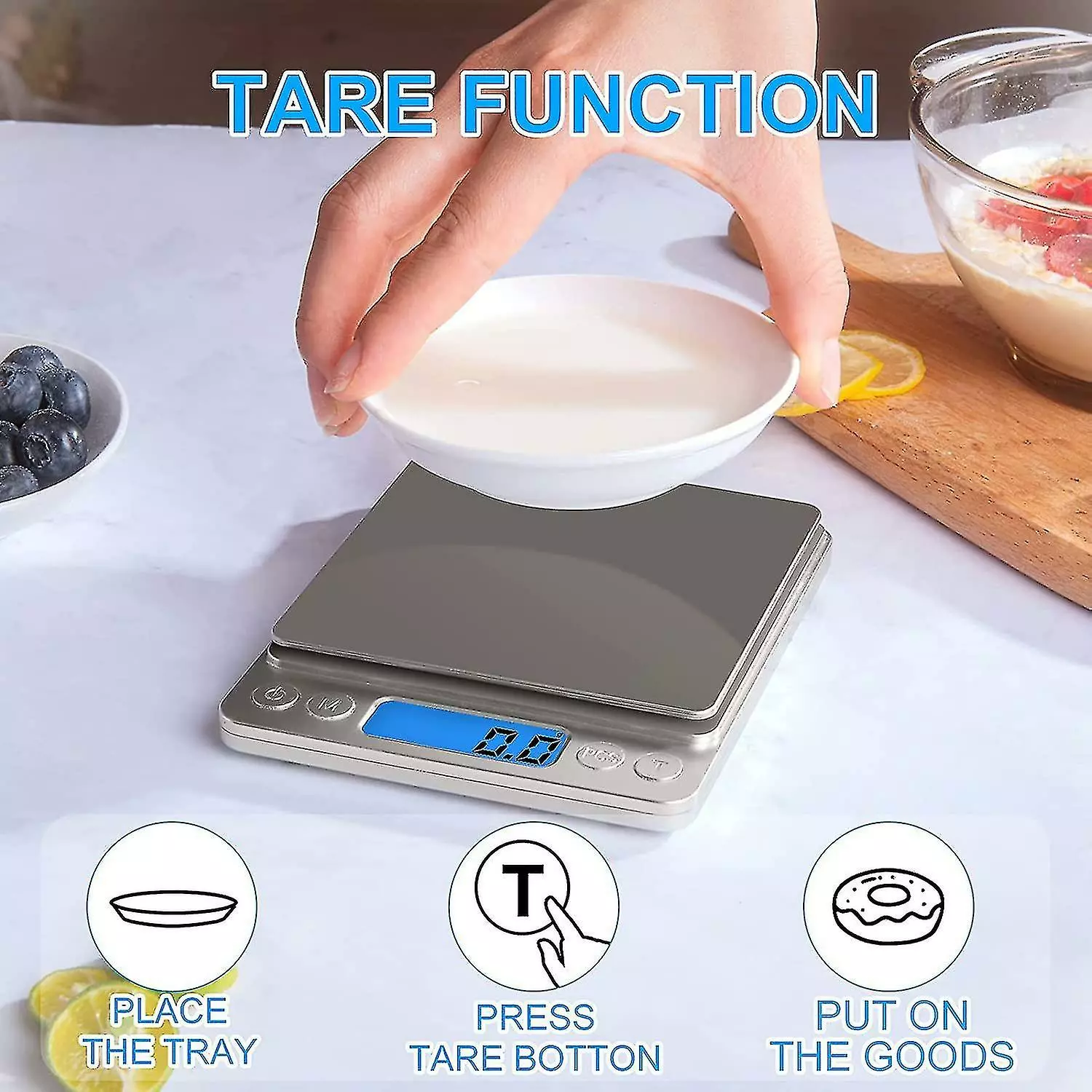 Tare functionPut the container on the kitchen scale, press the (T) key, the screen will display zero, then put in the item you need, the weight of the item will be clearly displayed on the LCD screen. Elderly can use it easily. The backlit display meets your reading needs, protects your eyes, and allows you to have a healthier body.