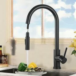 Touch Sensor Kitchen Sink FaucetFeature Swivel Spout,pull Out sprayerFinish ushed Nickel/Black/GoldNumber of Handles Single HandleInstallation Method Deck MountFaucet Total Height 38.5cmSpout Height 9.84″Valve Type Ceramic ValveFaucet Body Material Stainless SteelFaucet Spout Material ABSWater Feature Mix Hot and ColdWater Pressures Minimum 0.5 bar, 0 bar recommendedSafety first designed for drinking water use are fully compliant with the latest federal and state lead free standards