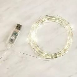 The LED lights are evenly placed along a thin wire and emit a warm white light. The wire can be bent and wrapped around objects, which makes it easy to attach the lights anywhere you want.