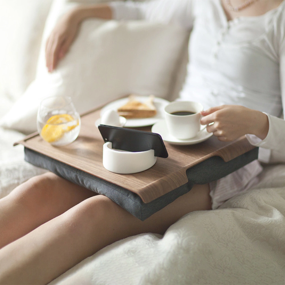 Enjoy an amazing breakfast in bed or use your laptop on this luxurious tray in walnut! The tray is fixed on a grey cushion made of 100% cotton, and with the anti-slip surface, the items you place on the tray won’t slip away.