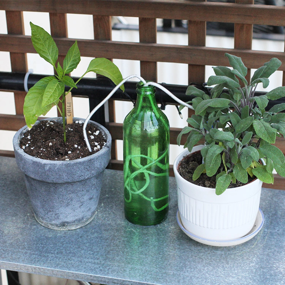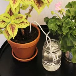 The watering wick will now transfer water from the container to the pot depending on your plants’ needs. The soil will absorb the water from the wick, which uses capillary action to transport the water from the container to the pot. The plastic cover around the wick prevents the water from evaporating on its way from the container to the plant pot.