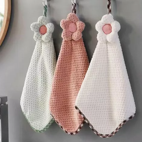 4 Hanging Kitchen Towels with Loop, Bathroom Hand Towels, Absorbent Microfiber Dry Hand Towels, Thick Cleaning Cloths. NOVEL DESIGN – Hanging hand towels for bathroom kitchen, handy lanyard design, it is convenient for you to hang cute little towels next to the kitchen sink, next to the washbasin, anywhere you feel comfortable wiping your hands. This can be used not only as a dry towel, but also to beautify life and decorate the family. EASY STORAGE: There is a storage strap on the hand towel, which can be hung up to dry after use. Don’t worry about not finding it the next time you use it. White towels and gray towels are easy to clean and hang anywhere with the attached hanger. WIDE RANGE OF APPLICATIONS: Hand towel suitable for various cleaning tasks, such as tables, mirrors, windows, TV screens, counters, kitchens, bathrooms, restaurants, offices, cars.
